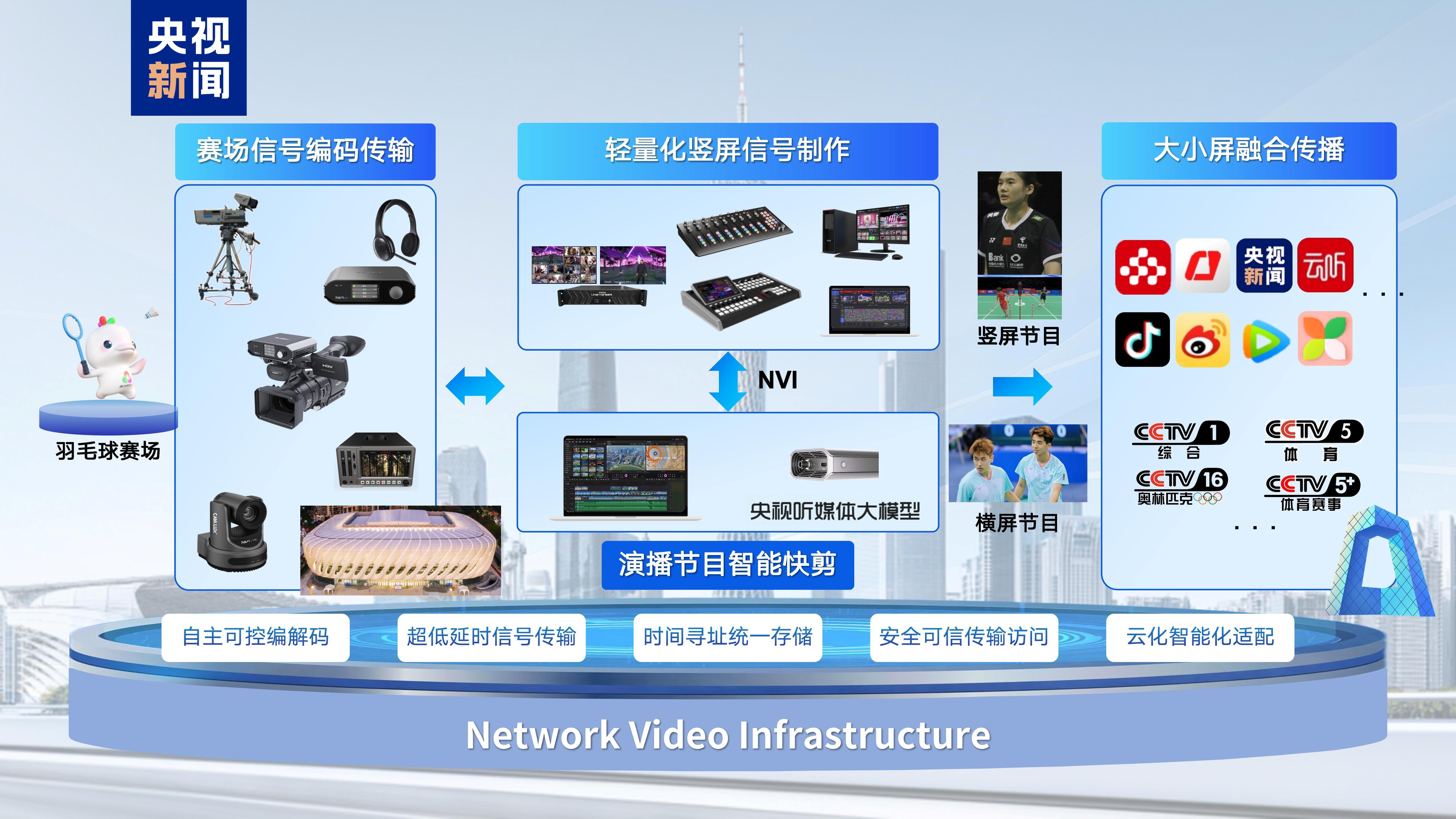 总台牵头研发的NVI(Network Video Infrastructure)全媒体超高清制播技术,首次应用于全运会羽毛球竖屏赛事直播,为观众带来新形态直播体验。NVI以AVS、菁彩视听等我国自主可控的创新技术构建制播技术体系,并兼容国际标准,以轻量化、灵活性和定制化属性,适配大小屏、横竖屏、轻量化制作需求,为全媒体超高清制播提供强大技术支撑。