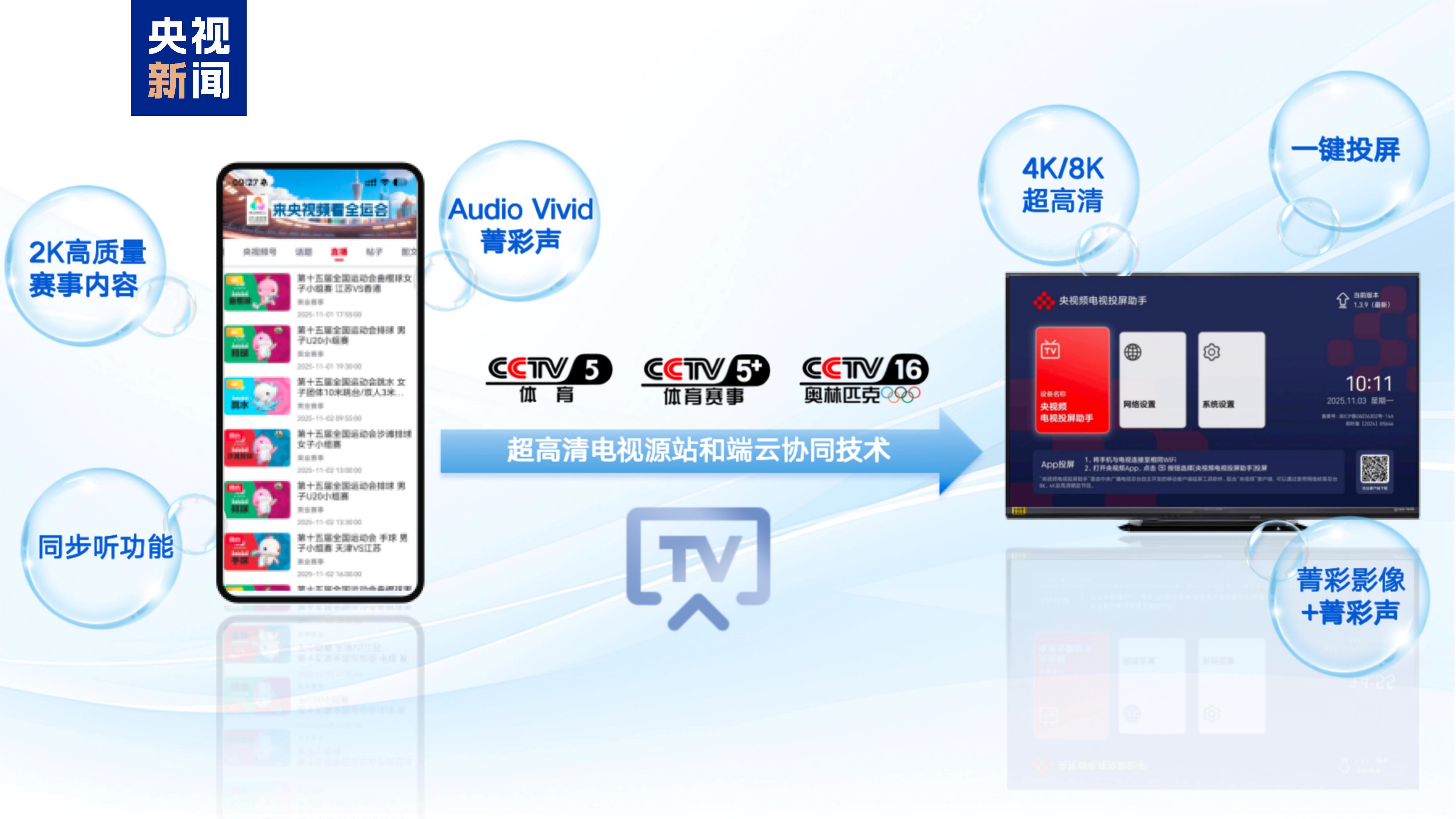 总台积极推进超高清大小屏融合传播,“央视频”等新媒体客户端在手机小屏提供2K超高清赛事内容和双耳渲染的菁彩声伴音;还建设高质量电视源站,在电视机端上线“央视频电视投屏助手”电视应用软件,用户通过投屏即可将电视一键投屏到电视机,完成投屏操作只需5秒,与此同时,用户还可以通过手机耳机收听到与电视同步的双耳渲染的三维菁彩声电视伴音,享受“菁彩影像+菁彩声”的高品质视听盛宴。