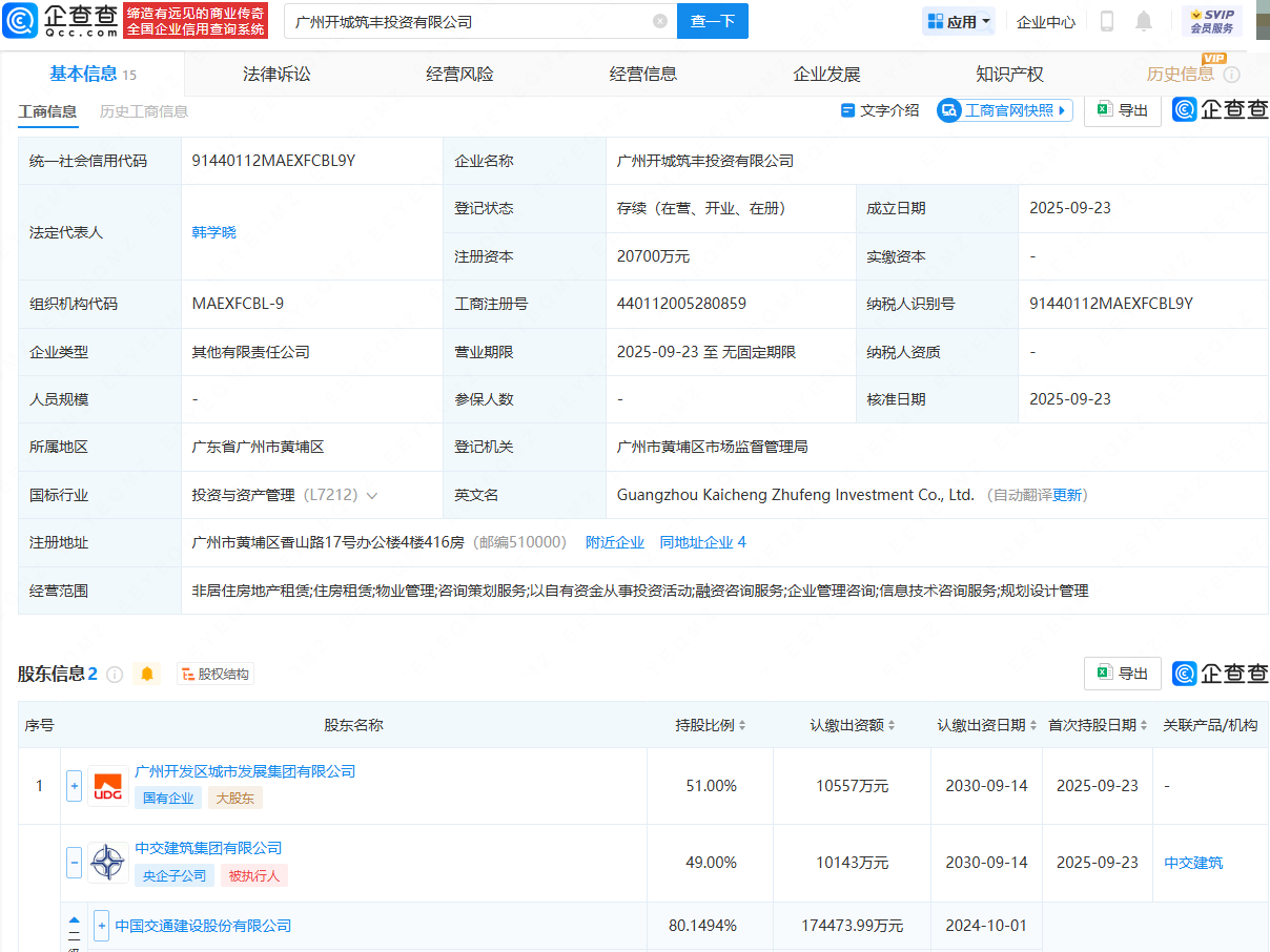近日金惠配资,广州开城筑丰投资有限公司成立,法定代表人为韩学晓,注册资本为2.07亿元,经营范围包含:非居住房地产租赁;住房租赁;物业管理;咨询策划服务;以自有资金从事投资活动等。企查查股权穿透显示,该公司由广州开发区城市发展集团有限公司、中国交建(601800)控股子公司中交建筑集团有限公司共同持股。